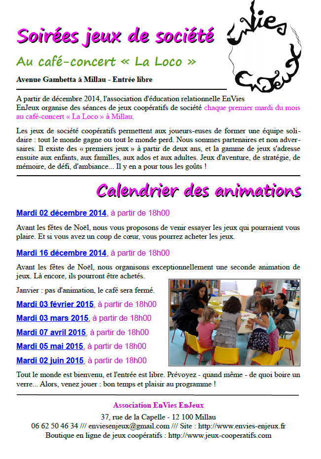 EnVies EnJeux animera désormais chaque premier mardi du mois des jeux de société coopératif au café-concert "La Loco", rue Gambetta à Millau.